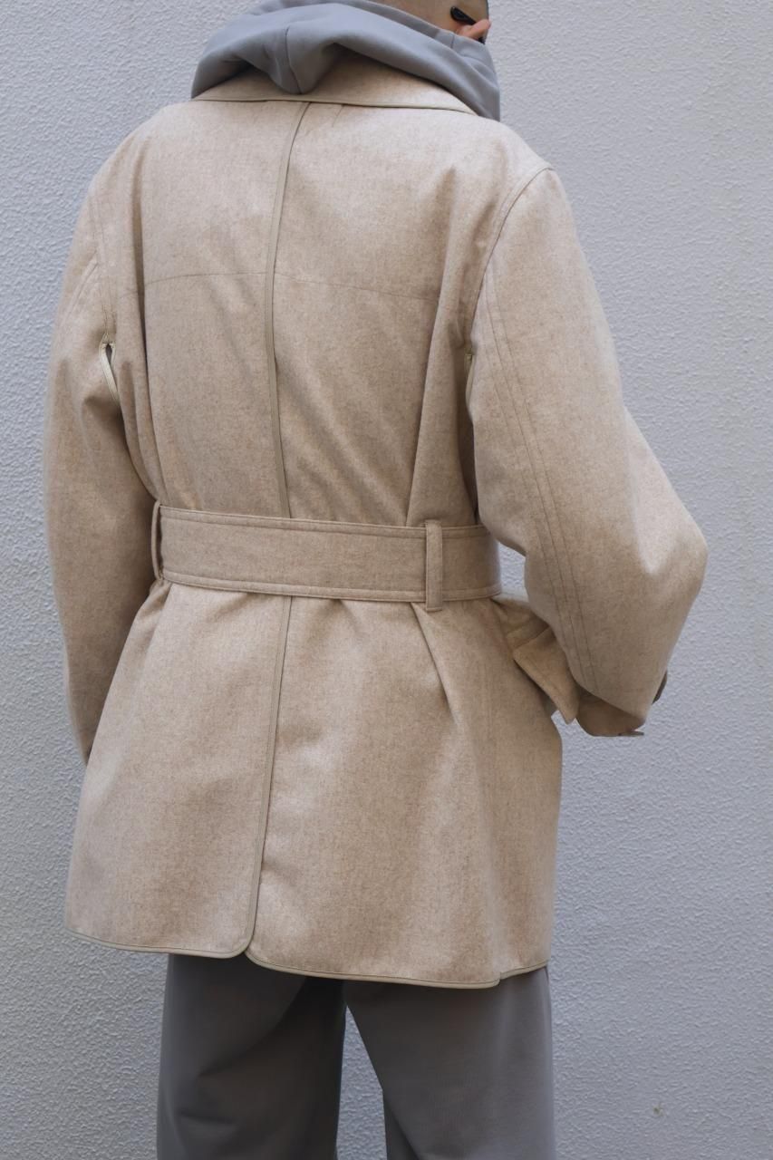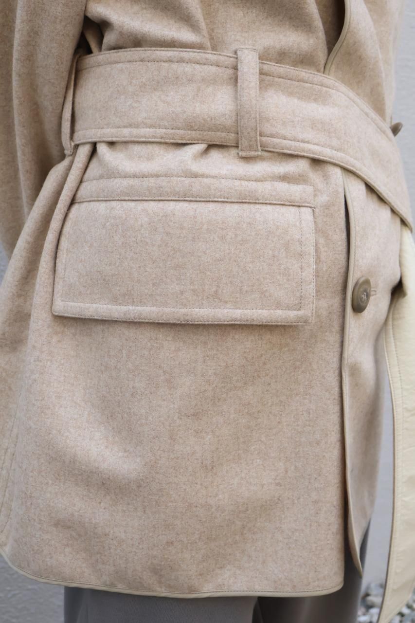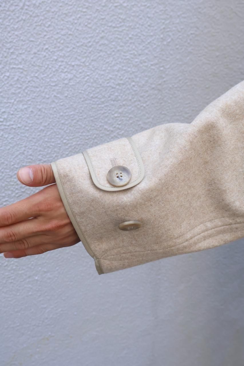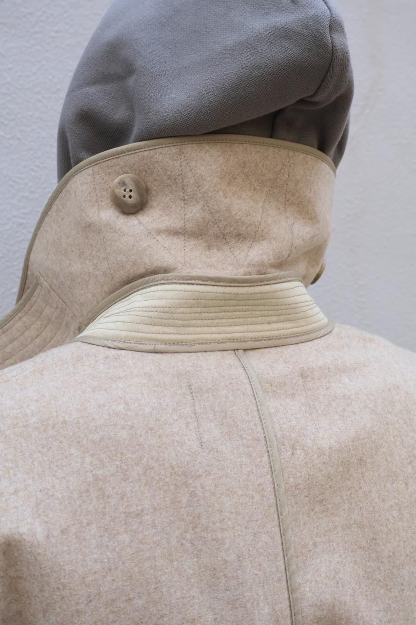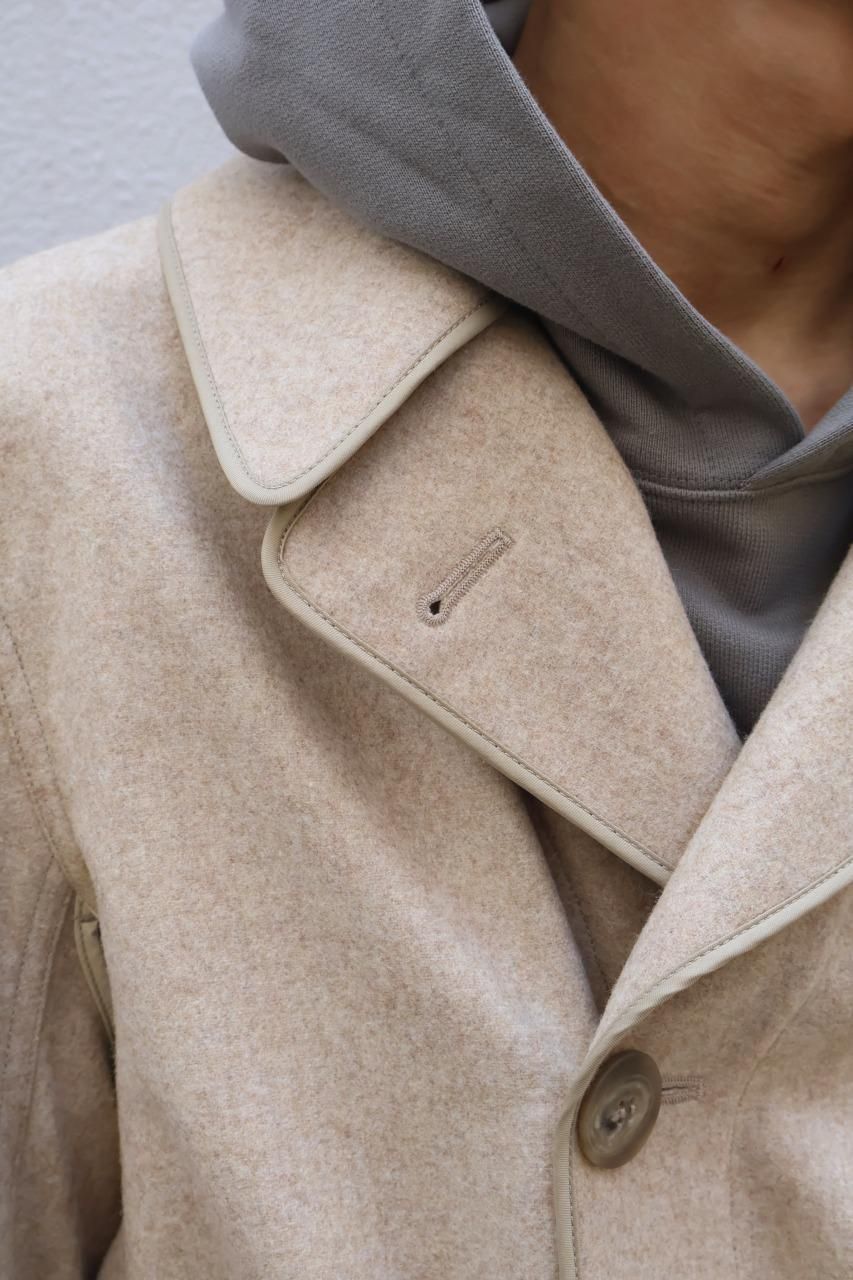 表情豊かで深みのあるメランジカラー、上品な光沢が特徴のウール / ライトメルトン素材に、光沢ある裏地での異素材パイピングデザインを組み合わせました。