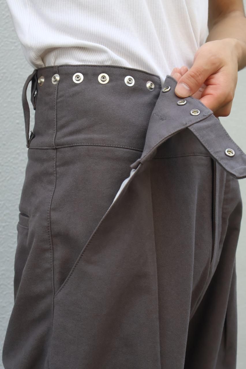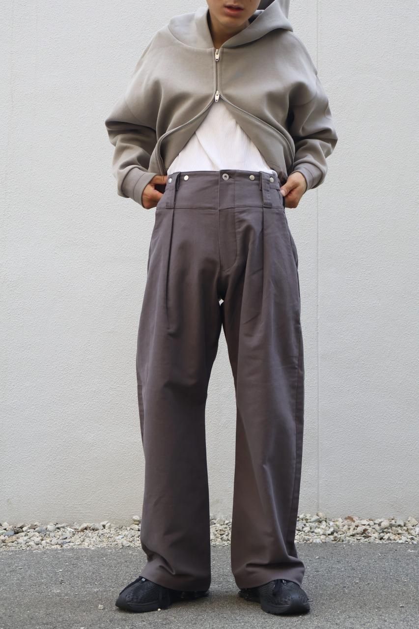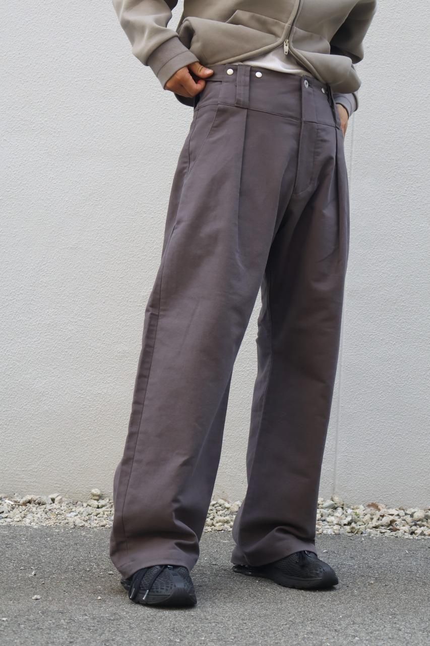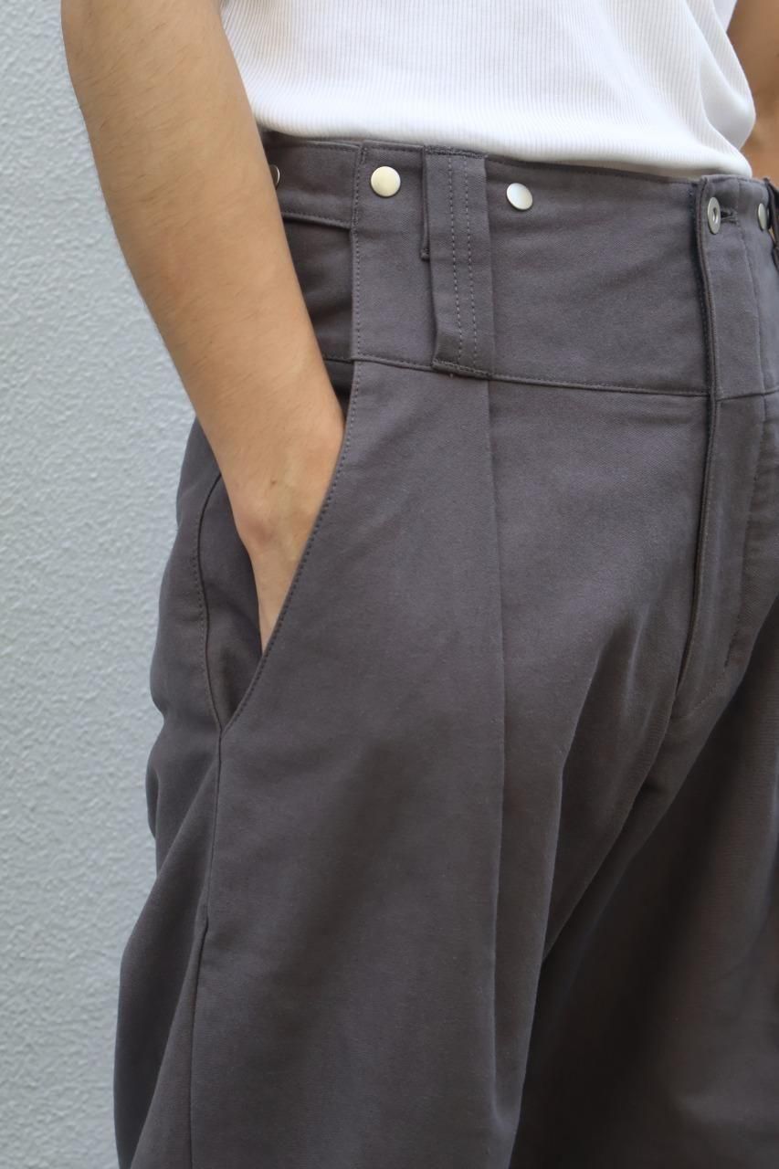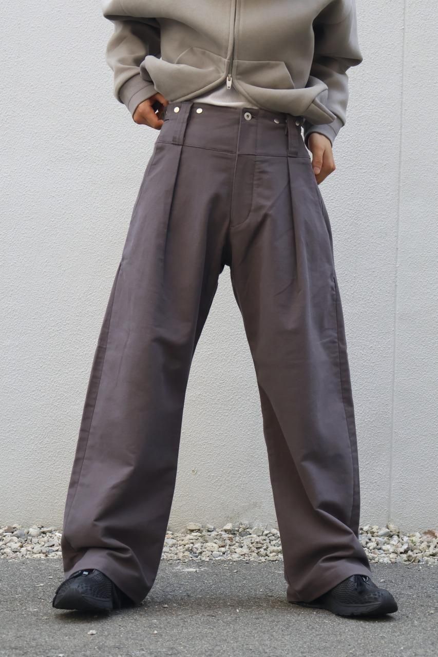ウエストバンドを大きく配置することで、セーラーパンツとミリタリーパンツのアジャスターをミックスしたような設計になっており、大幅にウエストを調整できる、ワイドタックパンツ。