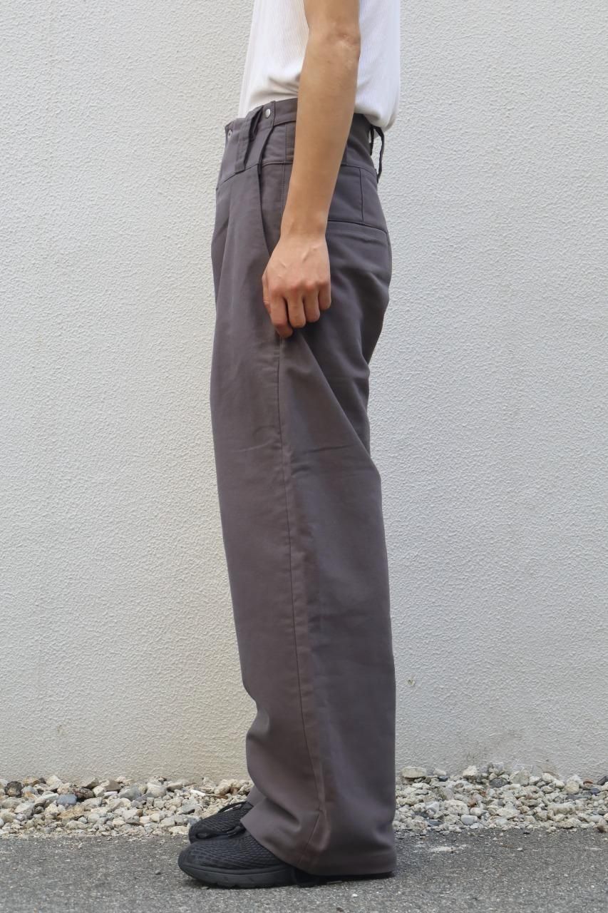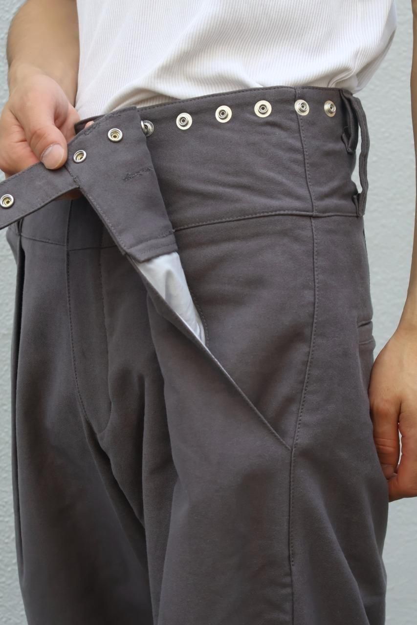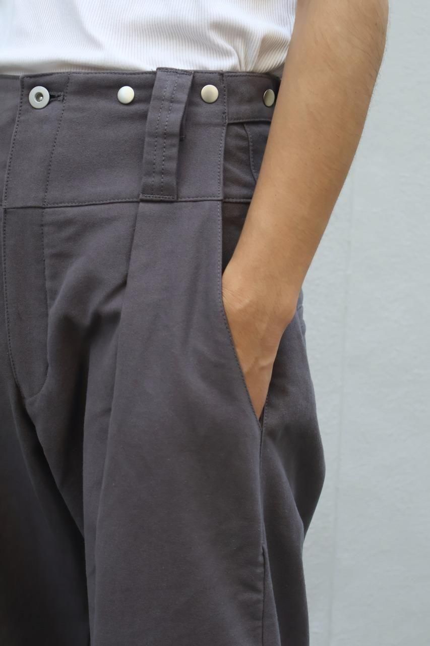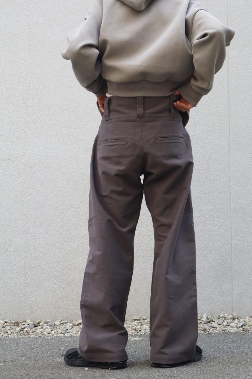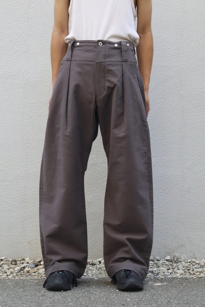 ウエストバンドを大きく配置することで、セーラーパンツとミリタリーパンツのアジャスターをミックスしたような設計になっており、大幅にウエストを調整できる、ワイドタックパンツ。