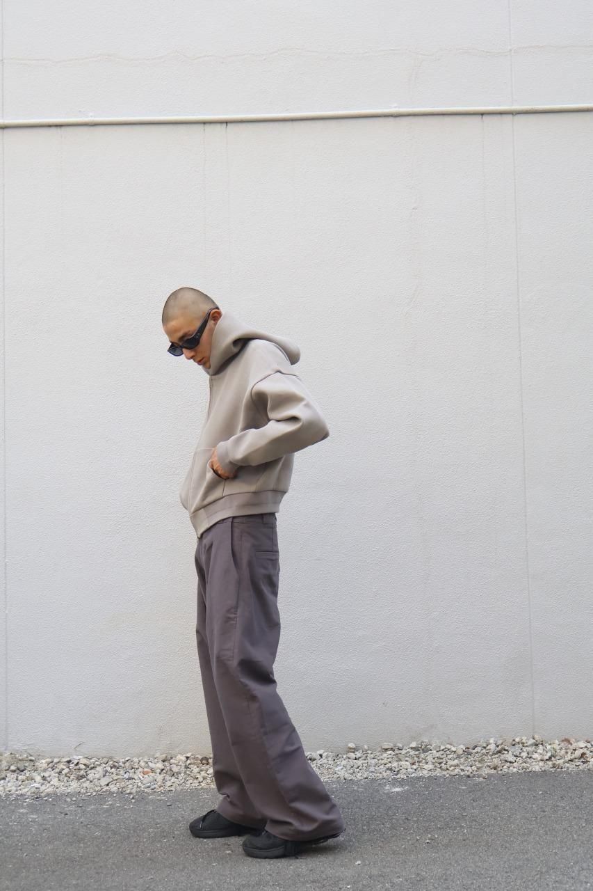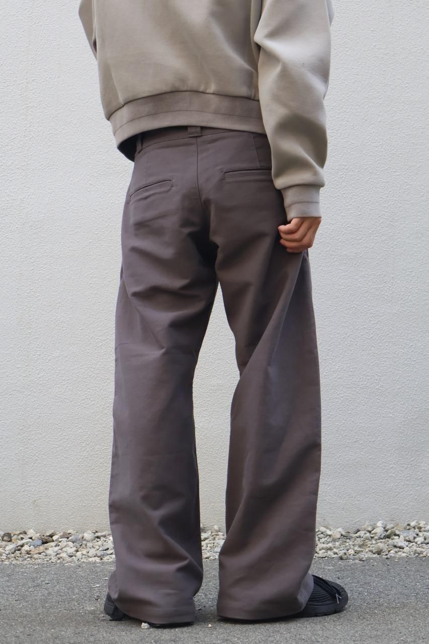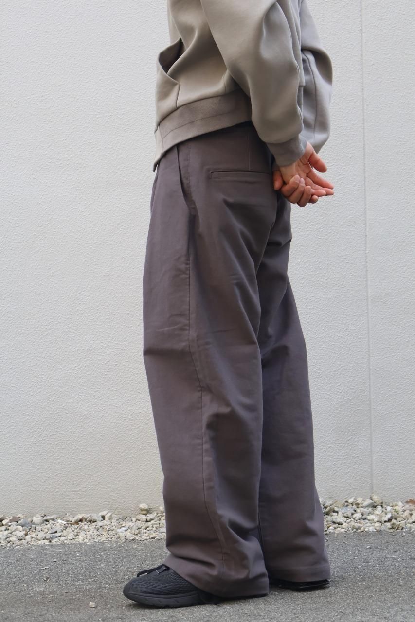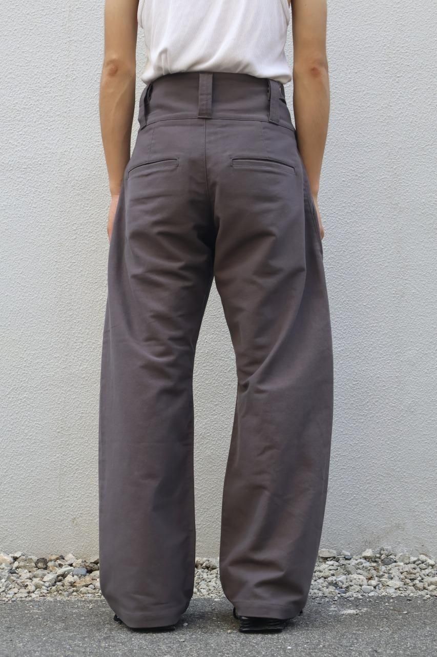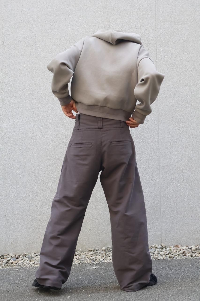 ウエストバンドを大きく配置することで、セーラーパンツとミリタリーパンツのアジャスターをミックスしたような設計になっており、大幅にウエストを調整できる、ワイドタックパンツ。