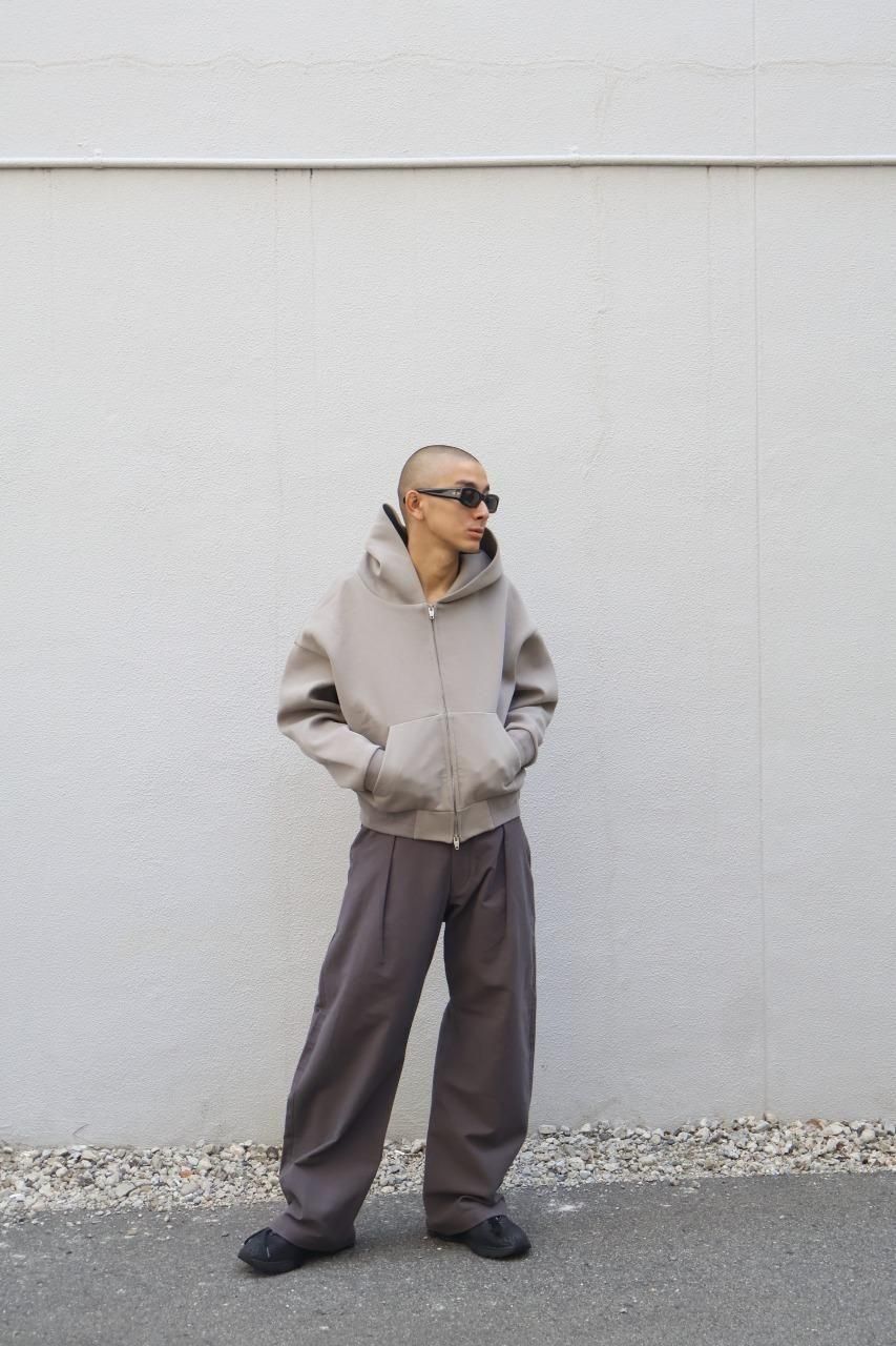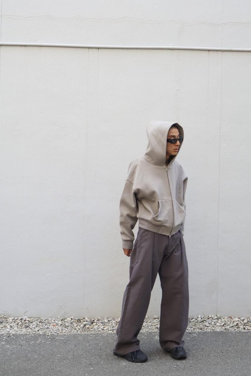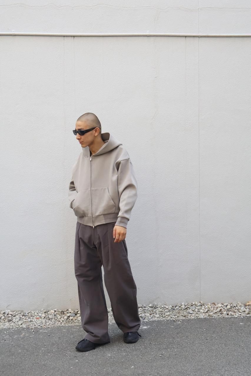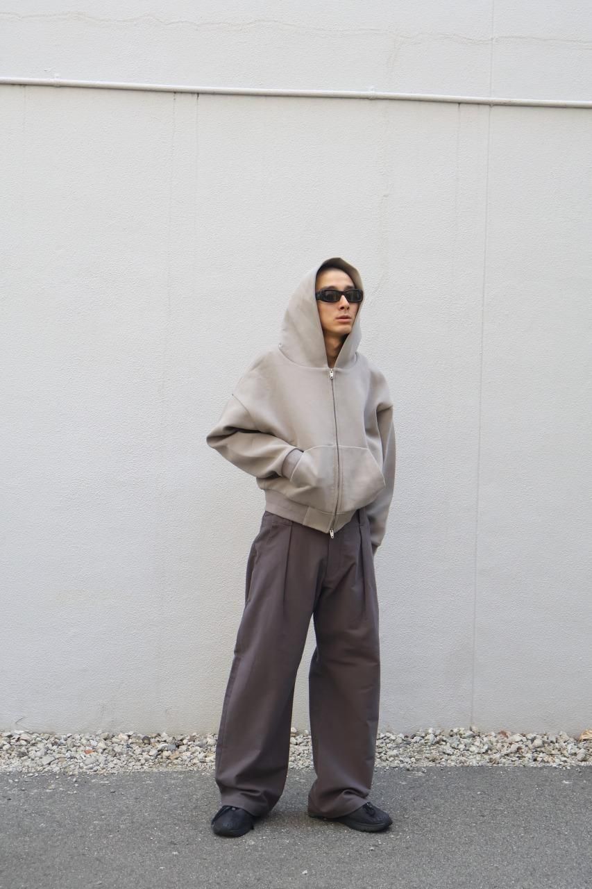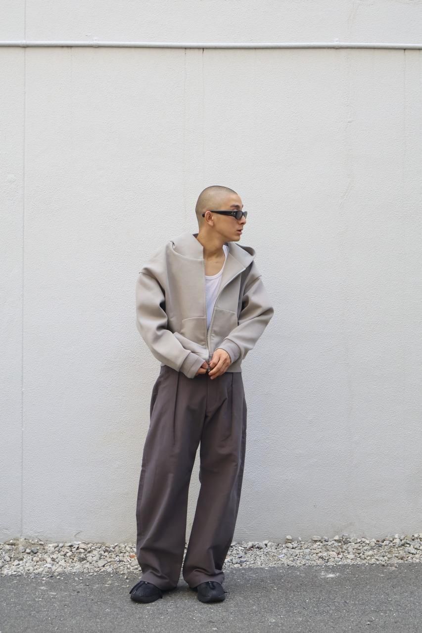 ウエストバンドを大きく配置することで、セーラーパンツとミリタリーパンツのアジャスターをミックスしたような設計になっており、大幅にウエストを調整できる、ワイドタックパンツ。