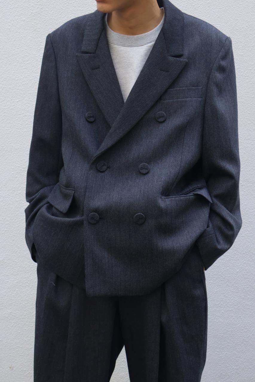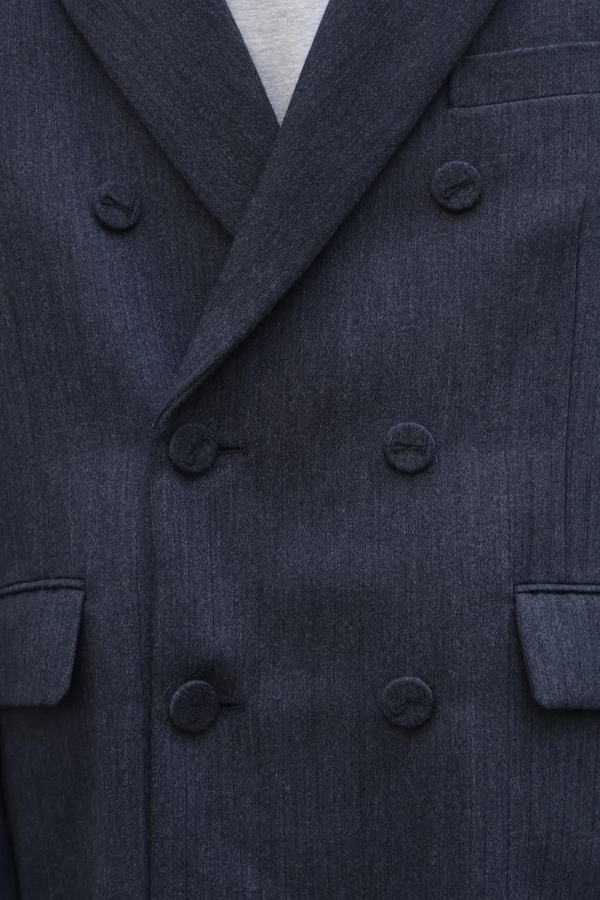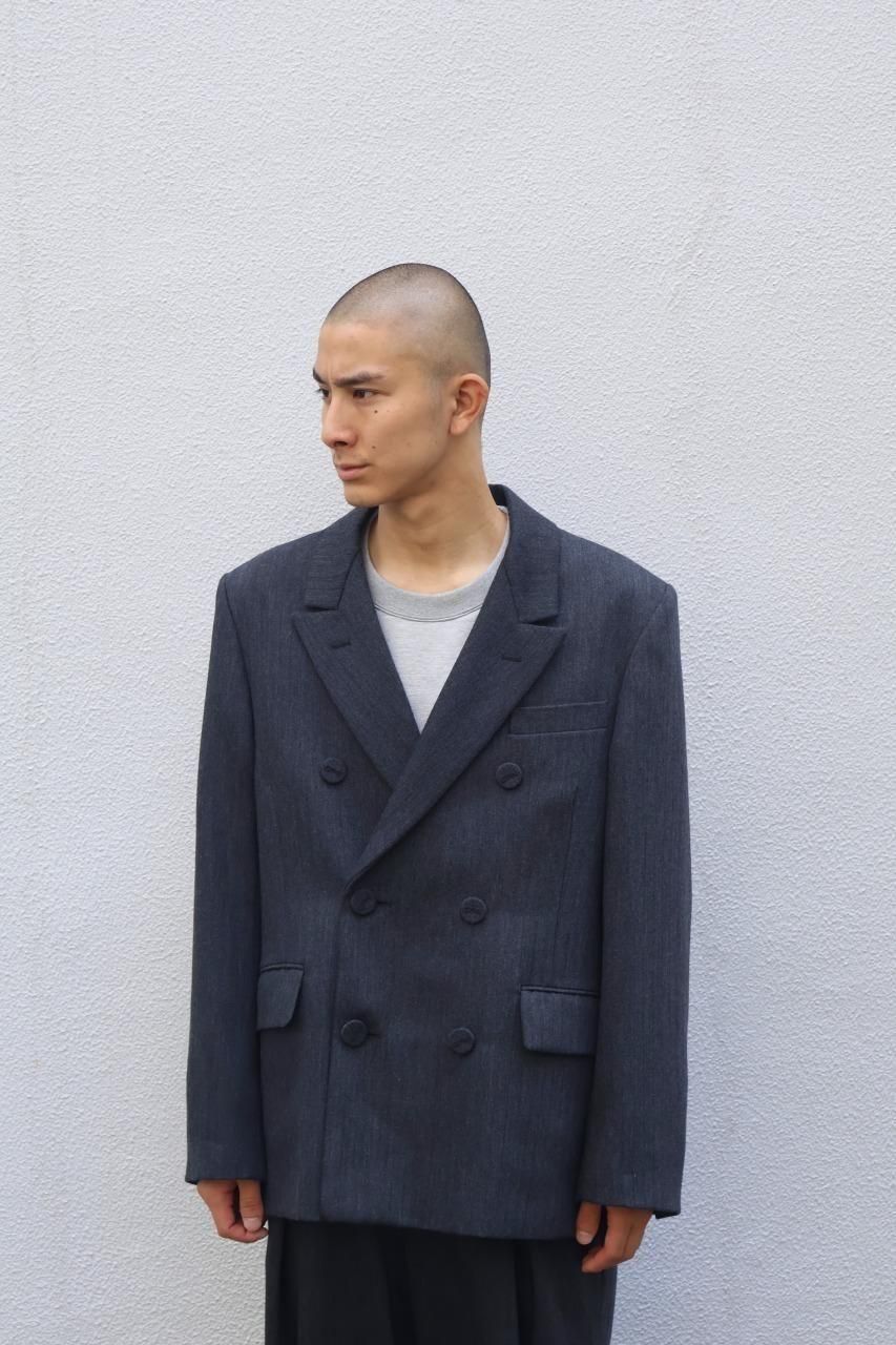 昔々、テーラーメイドであった祖父からデザイナーが譲り受けた、祖父自身が仕立てたダブルジャケットという、特別な1枚の衣服を、リスペクトを込めながらサンプリングし、現代の衣服として再構築した新しいパターン、素材を使用したグランパシリーズのダブルジャケット。