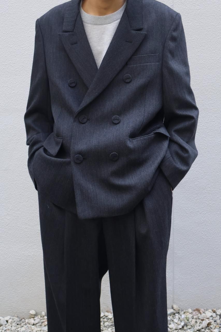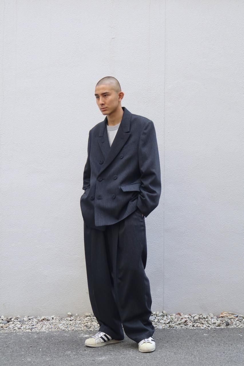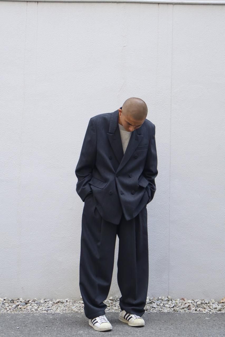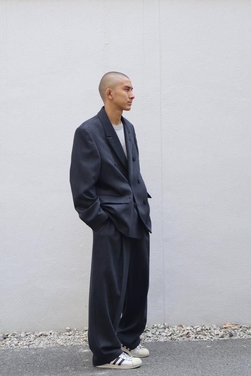 昔々、テーラーメイドであった祖父からデザイナーが譲り受けた、祖父自身が仕立てたダブルジャケットという、特別な1枚の衣服を、リスペクトを込めながらサンプリングし、現代の衣服として再構築した新しいパターン、素材を使用したグランパシリーズのダブルジャケット。