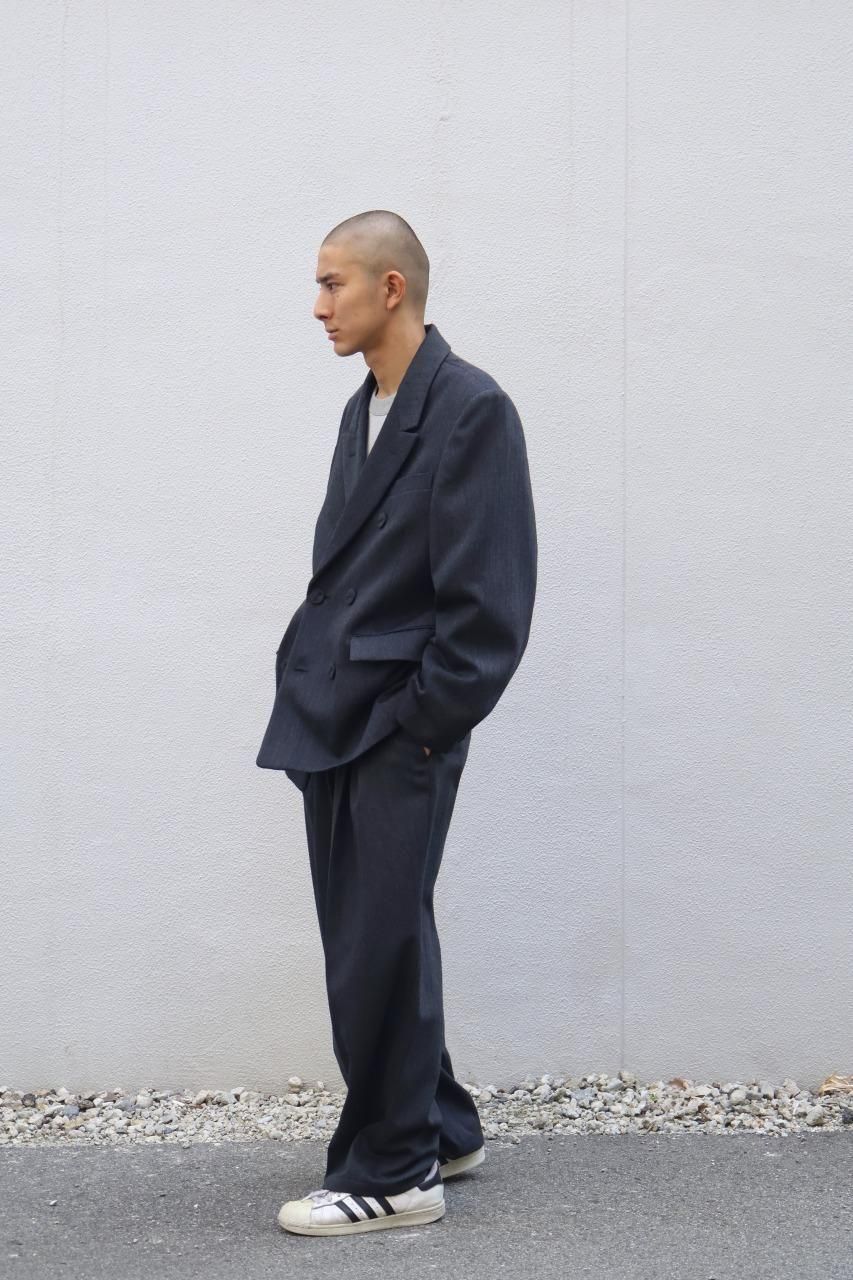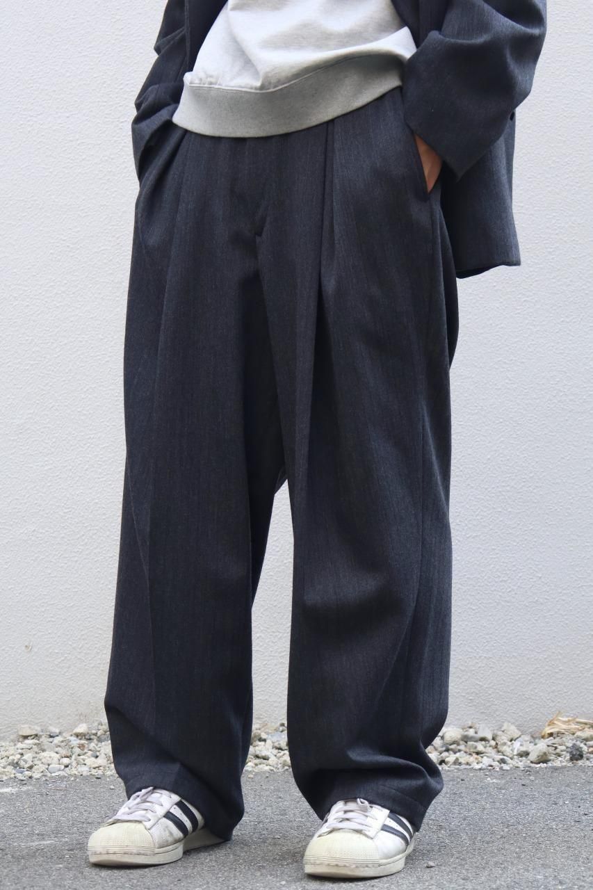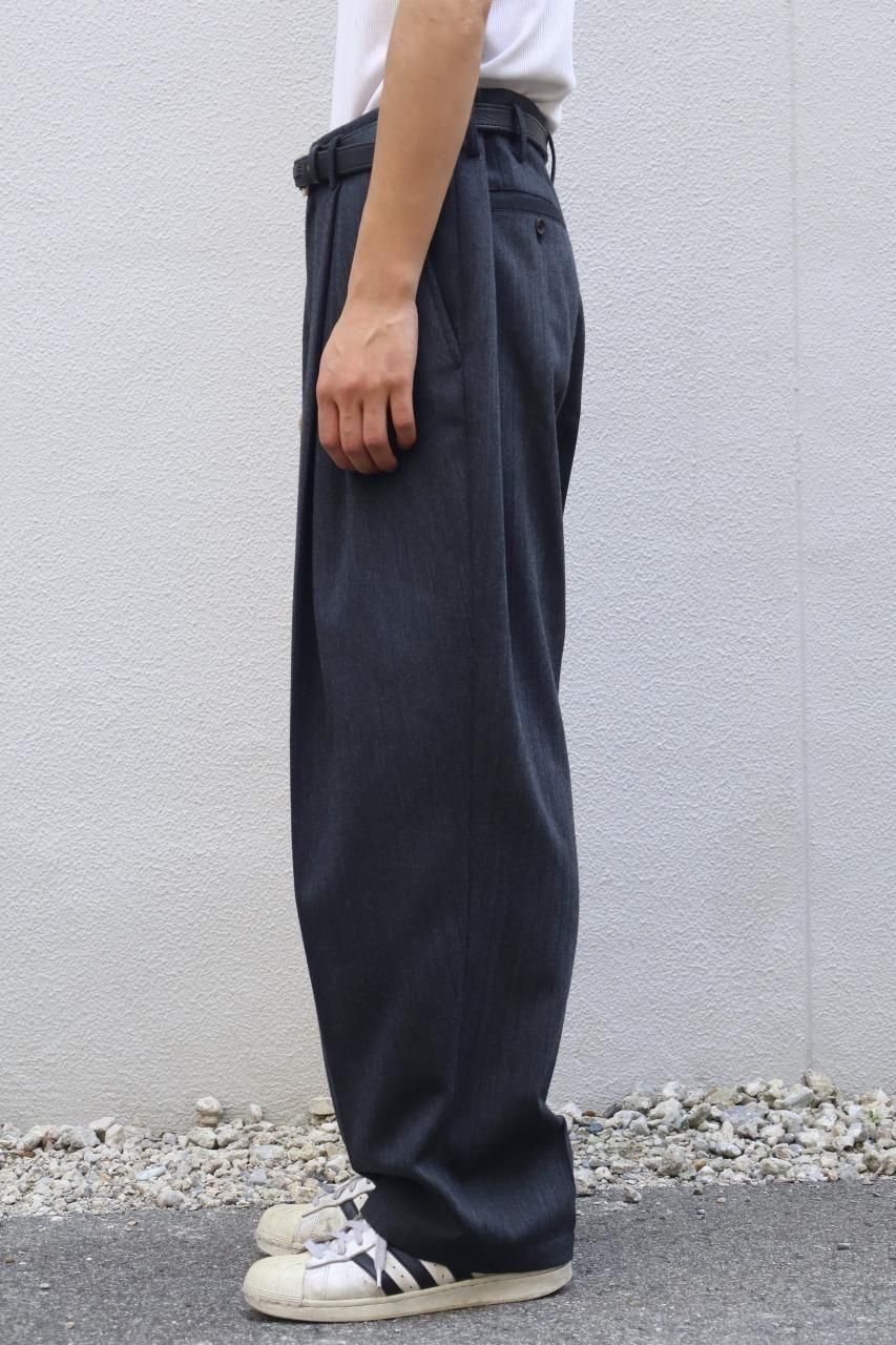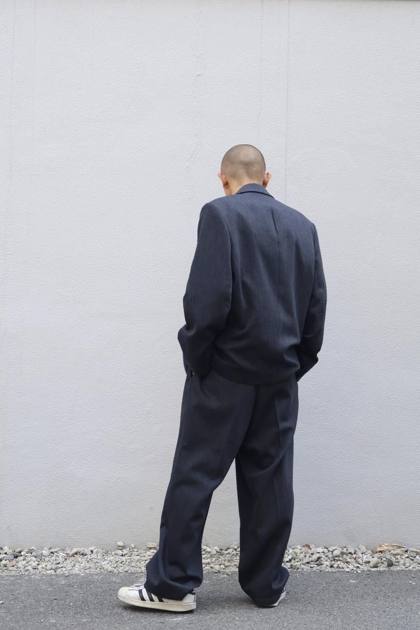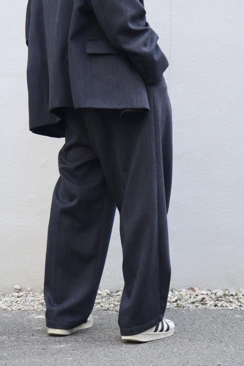 ブランドがオリジナルで作成した、光沢のあるベネシャン素材を使用した、光の角度によってストライプ柄が浮き出るシャドーストライプが特徴の、テーパードスラックスパンツ。