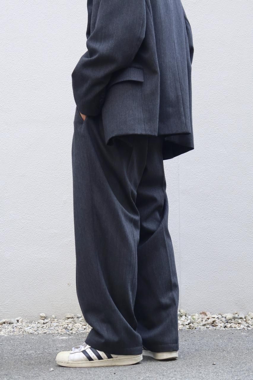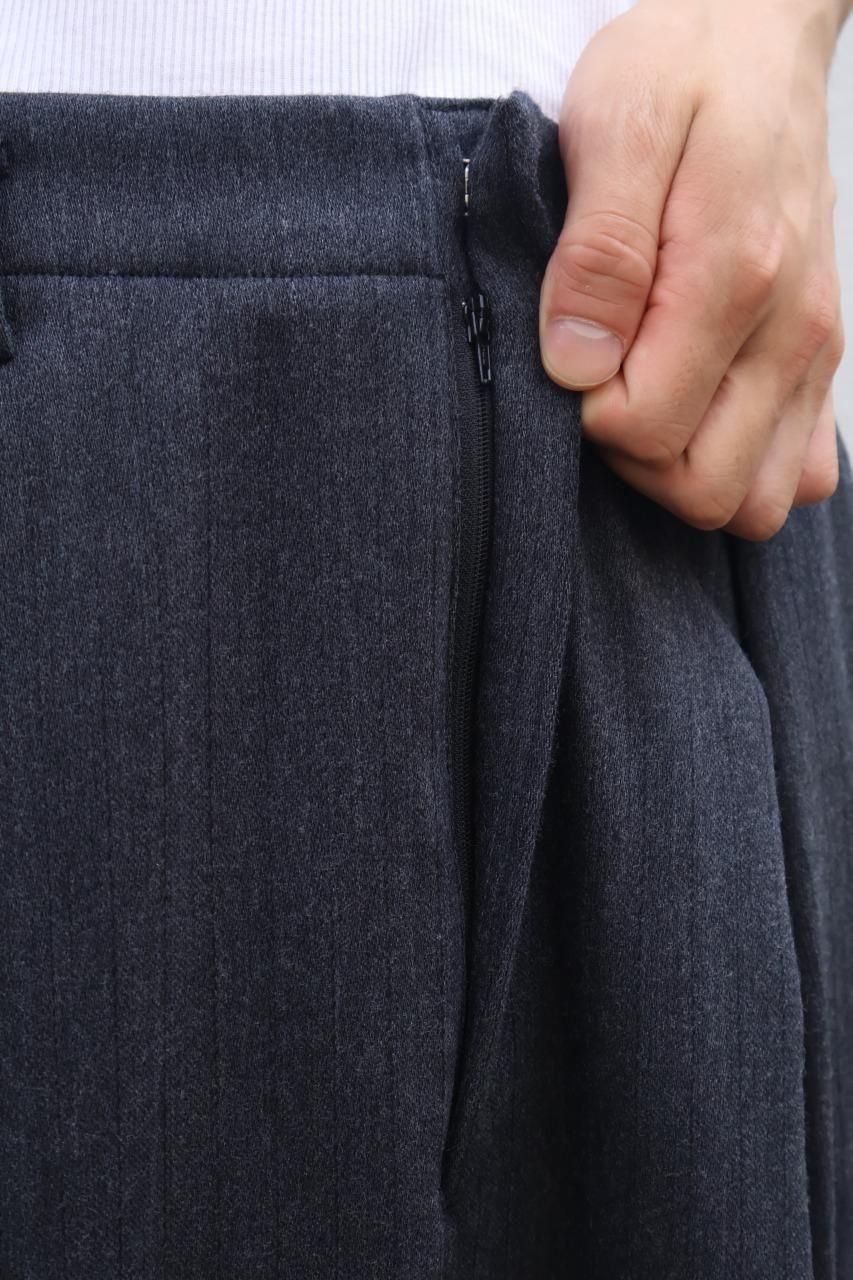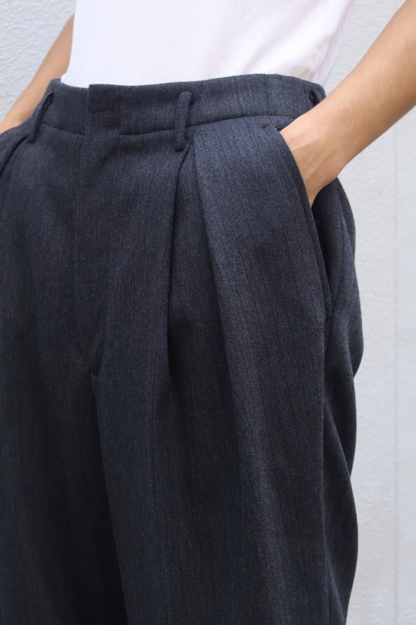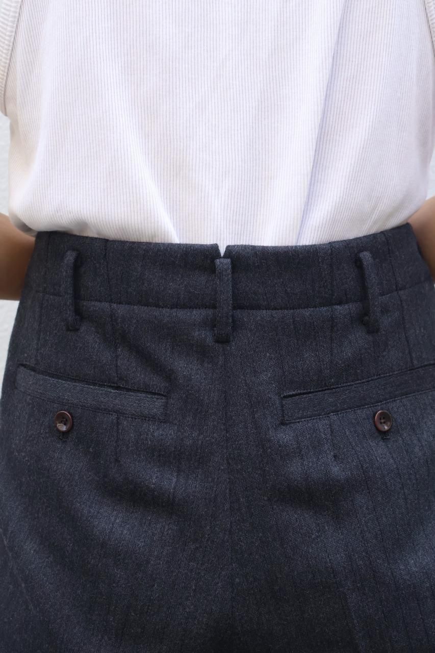 大きな分量を取った、インパーテッドボックスプリーツを1つのタックとして組み込み、ブランド独自のテーパードシルエットを作成。